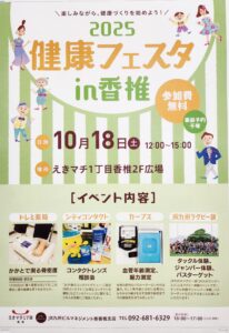2025年10月18日(土)12:00~15:00で健康フェスタin香椎をえきマチ1丁目香椎2階広場にてえきマチ1丁目香椎テナント合同で開催いたします。