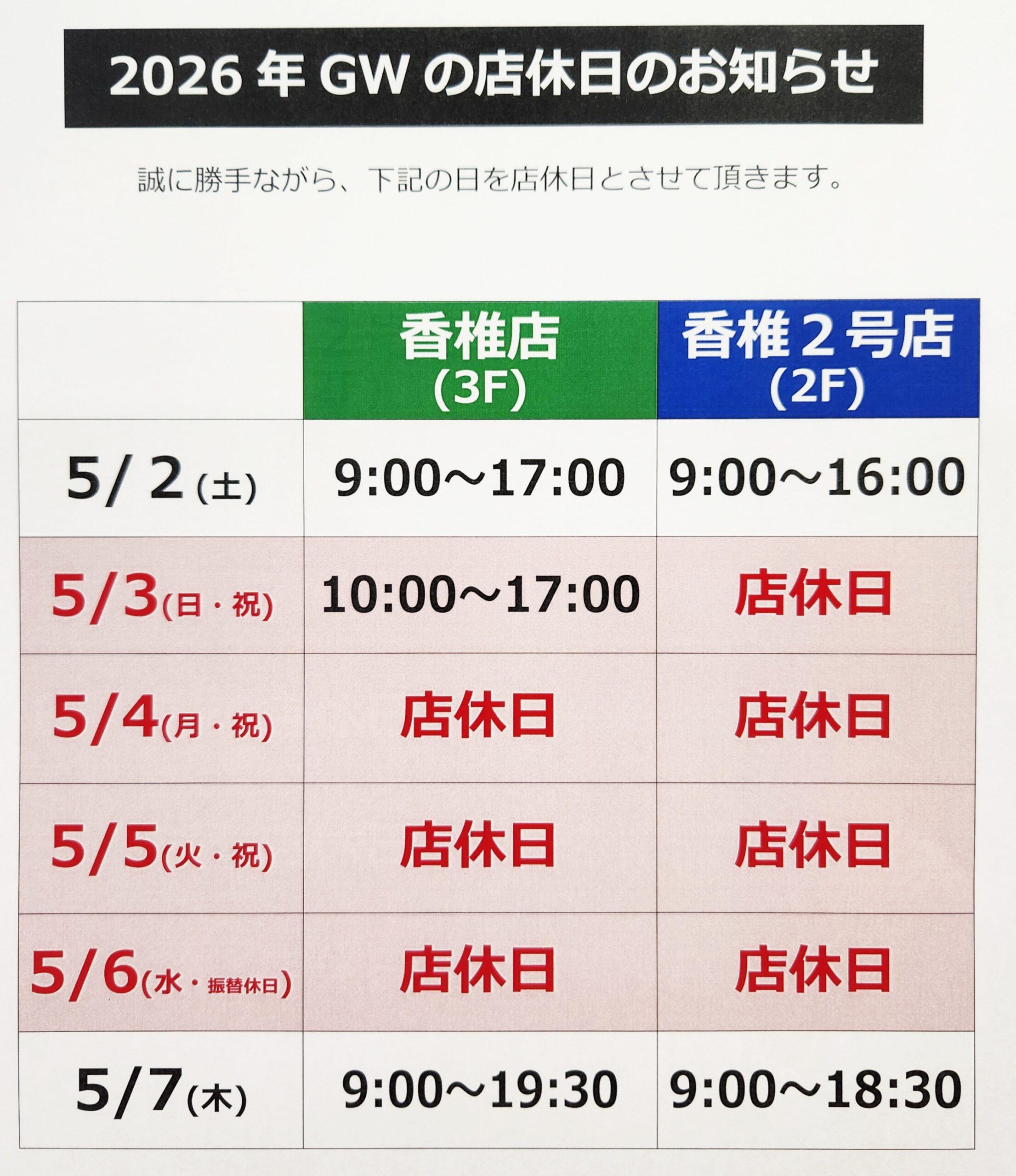 今年は5月3日(日・祝)は3F香椎店は営業いたします。